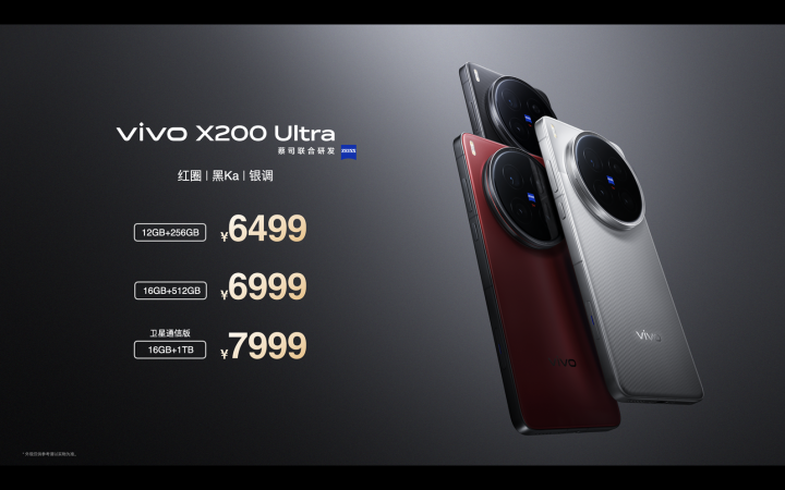 两款新品价格在此次发布会上公布,其中vivoX200Ultra有12GB+256GB版本、16GB+512GB版本和16GB+1TB卫星通信版,售价分别为6499元、6999元和7999元,另外X200Ultra1TB摄影师套装售价9699元。