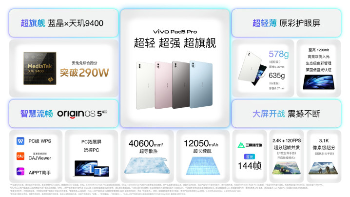 vivoPad5Pro作为“安卓超旗舰性能平板”,搭载安卓平板全球首发的蓝晶×天玑9400芯片,安兔兔综合跑分突破290万大关,实力演绎安卓平板性能的超强形态;再配合超轻薄原彩护眼屏,打造全场景超强显示体验。系统级蓝心大模型赋能,以及PC级WPS等专业适配,是大屏移动游戏与轻办公生产力的新选择。vivoPad5Pro已在vivo官网及各大电商平台开启预售,云霞粉、春潮蓝、与寒星灰三种配色将于4月25日正式开售,价格2999元起;vivoPad5Pro超轻版轻羽白配色将于4月29日限时开售。首销期间在各大电商平台购机可享国补优惠,低至2549.15元起。