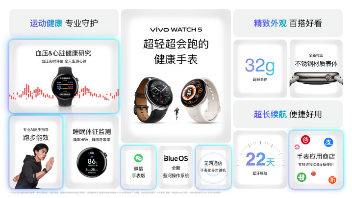 “超轻超会跑”的智能穿戴新品vivoWATCH5,不仅搭载专业AI跑步指导,还有无感血压风险评估,刷新专业运动监测与健康监测的新高度。凭借其最低仅32g的超轻量级金属机身,至长22天蓝牙续航,为用户带来全场景、高品质的腕上智慧体验。vivoWATCH5已在vivo官网及各大电商平台开启预售,并将于4月29日正式开售,价格799起。首销期间在各大电商平台购机可享国补优惠,低至679.15元起。