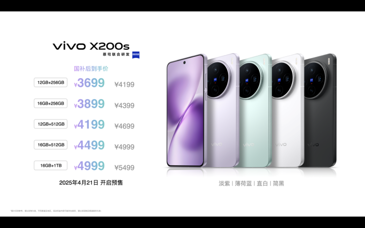 vivoX200s采用淡紫、薄荷蓝、直白、简黑四款时尚配色,将于4月25日开售,起售价4199元,享受国家补贴后到手价3699元起;vivoX200Ultra共有银调、红圈、黑Ka三款经典配色,将于4月29日开售,起售价6499元。